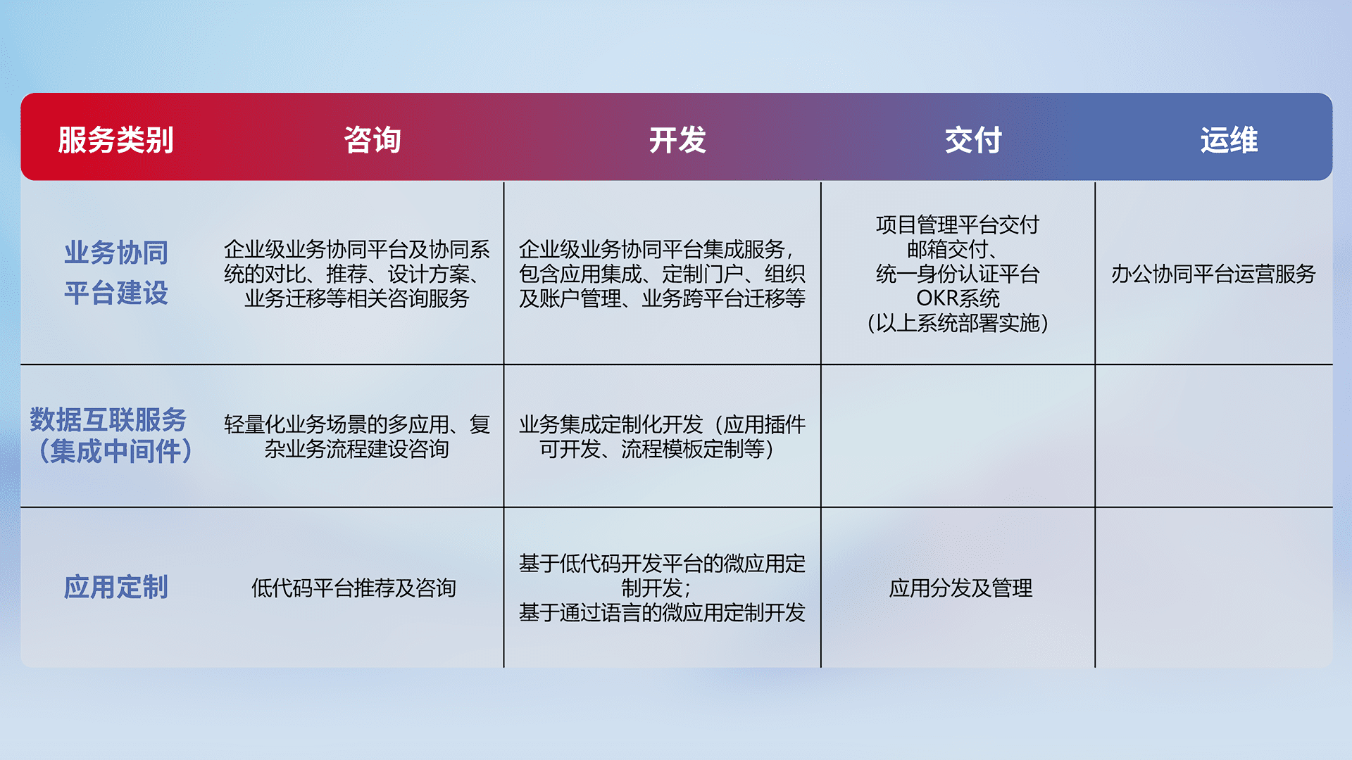 针对钉钉、、、、企微、、IDaas等平台级产品提供产品的规划、、、方案、、、交付、、、、定制化开发等服务,,实现如统一协同办公、、、、智能客户服务、、混合会议管理、、、智能数据查询、、等业务场景,,实现数字化转型。。。